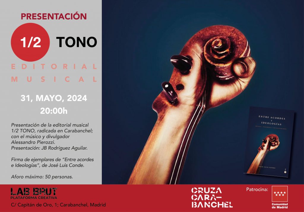 Presentación de la nueva editorial de divulgación musical «1/2 Tono», con sede en Carabanchel; con la presencia del músico y divulgador Alessandro Pierozzi, que nos dará a conocer el proyecto editorial y el primer título publicado: «Entre acordes e ideologías», obra del musicólogo argentino José Luis Conde. Dentro del Festival Cruza Carabanchel 2024, organizado por Carabanchel Distrito Cultural y patrocinado por la Comunidad de Madrid.