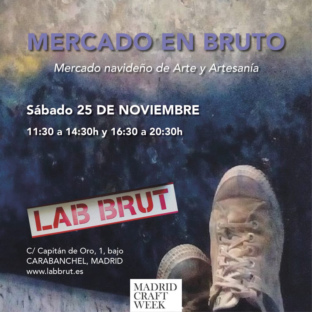 Mercado en Bruto: mercado navideño de Arte y Artesanía de Labbrut 2023; sábado 25 de noviembre, de 11:30 a 14:30h y de 16:30 a 20:30h. Coincidiendo con la celebración de Madrid Craft Week edición Navidad 2023, te invitamos a conocer nuestro espacio y producción creativa, así como a adquirir alguna obra de arte, cerámica, ropa artesanal, objetos decorativos, libros, etc. Abierto al público en general, entrada gratuita; aforo máximo: 30 personas simultáneamente en el local.