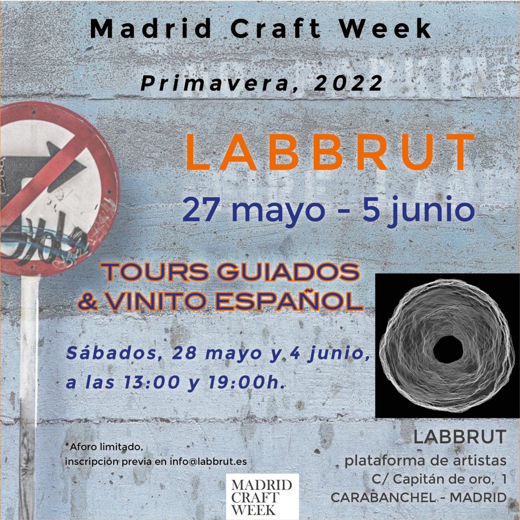 Volvemos a participar en la edición de primavera de Madrid Craft Week (27 de mayo a 5 de junio de 2022), en esta ocasión con recorridos guiados por nuestro espacio creativo, en donde podrás conocer a los diferentes artistas residentes de Labbrut, familiarizarte con su obra y socializar con un vino español.