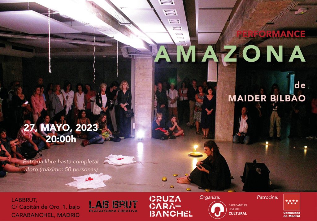 Performance de la artista Maider Bilbao a partir de una idea surgida en un viaje a Georgia y Armenia, cuya espiritualidad y liturgia de sus templos la impactaron enormemente. La acción comienza con una proyección de vídeo en donde aparece la Amazona realizando un entrenamiento marcial con su espada rodeada de naturaleza salvaje: bosques y cascadas que se grabaron durante este viaje. Al finalizar el vídeo la artista sale a escena con un sable. Tras una serie de movimientos, deja el sable en el altar y abre los 3 saquitos que cuelgan del techo. En el interior de cada saquito, hay 3 piedras de color dorado y pétalos de rosa que se depositan junto al altar formando un espacio ovalado. En el suelo quedan 3 flores formadas por el papel blanco de los saquitos y los pétalos rojos de rosa: la ofrenda a las mujeres guerreras.