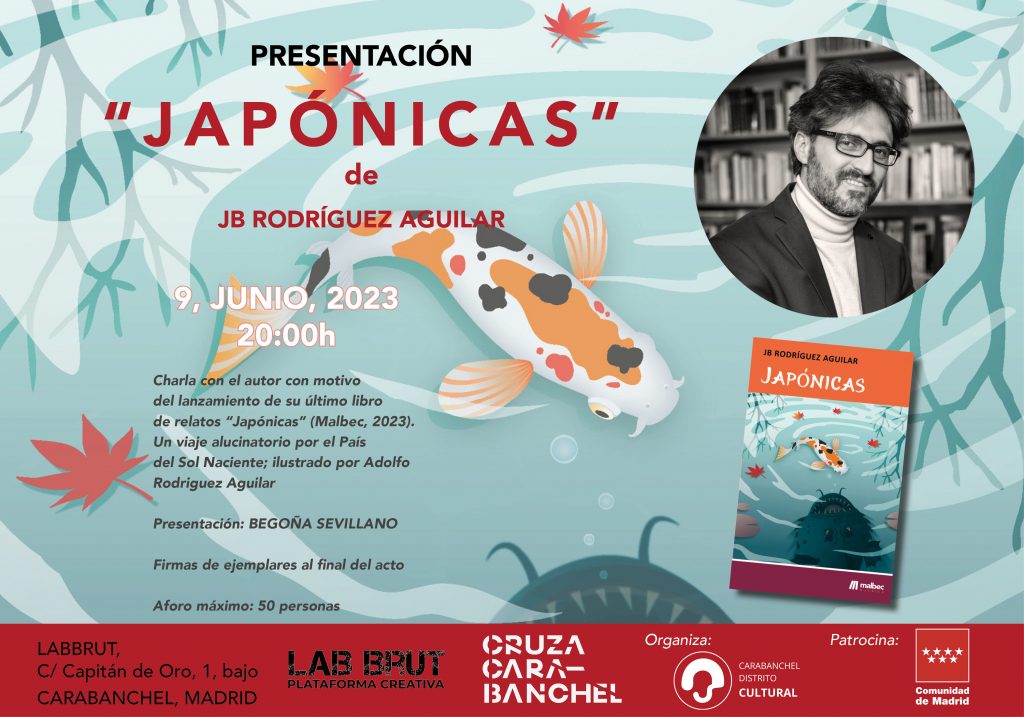 Charla con el autor JB Rodríguez Aguilar con motivo del lanzamiento de su último libro de relatos “Japónicas” (Malbec, 2023). Un viaje alucinatorio por el País del Sol Naciente, ilustrado por Adolfo Rodriguez Aguilar. Presentación a cargo de Begoña Sevillano. Firmas de ejemplares al final del acto. Festival CRUZA CARABANCHEL 2023.